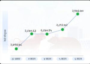 ६ साउन, काठमाडौं । मंगलबार सेयर बजार ८०.९७ अंकले बढेको छ । सो वृद्धिपछि नेप्से परिसूचक २९७३.७० अंकमा पुगेको छ ।