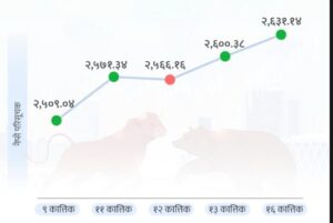 पछिल्लाे छ काराेवार दिनमा परिसूचक नेप्से १ सय २२ अकले बढेकाे छ । कार्तिक ९ गते नेप्से परिसूचक २ हजार ५ सय ९ अकमा रहेकाे थियाे । त्यस यता परिसूचक नेप्से ६ दिनमा बढेर २ हजार छ सय ३१ अकमा पुगेकाे छ ।
