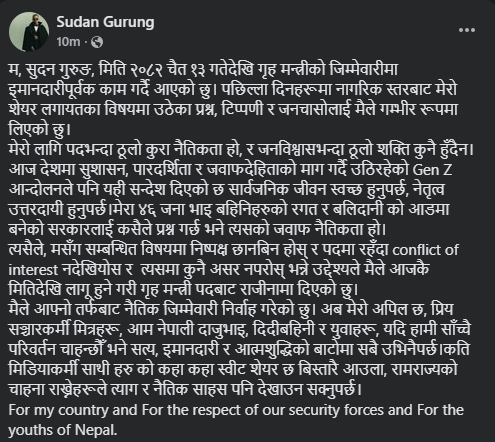 गृहमन्त्री गुरुङले आफ्नो राजीनामाबारे सामाजिक सञ्जालबाट जानकारी गराउँदै पदमा रहँदा स्वार्थको द्वन्द्व नदेखियोस् भनेर नैतिक जिम्मेवारी निर्वाह गर्दै आजकै दिनदेखि लागू हुनेगरी राजीनामा गरेको उल्लेख गर्नुभएको छ ।