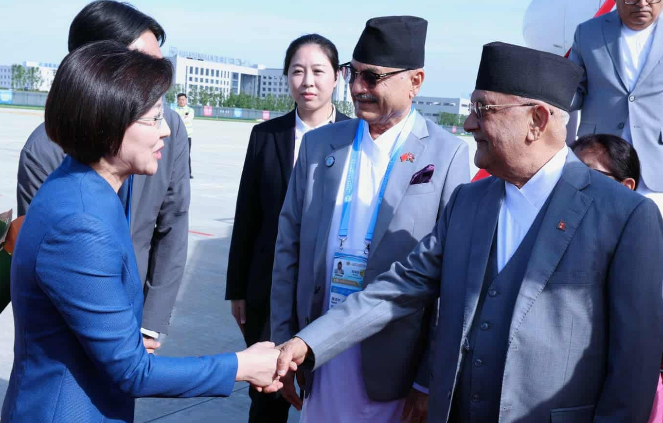 १४ भदाै   काठमाडौँ । प्रधानमन्त्री केपी शर्मा ओली शाङ्घाई सहयोग सङ्गठन (एससिओ) को शिखर सम्मेलनमा भाग लिन आज जनवादी गणतन्त्र चीनको थियानजिन सहरमा आइपुग्नुभएको छ । मित्रराष्ट्र चीनका राष्ट्रपति सी चिनफिङको मैत्रीपूर्ण निमन्त्रणामा नेपाली प्रतिनिधिमण्डलको नेतृत्व गर्दै प्रधानमन्त्री ओली स्थानीय समय अनुसार दिउँसो ३ः१५ बजे हिमालय एयरलाइन्सको विशेष विमानमार्फत थियानजिन विनहाइ अन्तर्राष्ट्रिय विमानस्थलमा आइपुग्नुभएको हो । उहाँलाई चीन सरकारका उच्च अधिकारी र  चीनका लागि नेपालका राजदूत डा कृष्णप्रसाद ओली, नेपालका लागि चीनका राजदूत चेन सोरलगायतले स्वागत गर्नुभयो । आजै राष्ट्रपति सी र प्रधानमन्त्री ओलीबीच भेटवार्ता हुने कार्यक्रम रहेको परराष्ट्र मन्त्रालयले जनाएको छ । तस्बिर : दिनेश भण्डारी, प्रधानमन्त्रीको सचिवालय